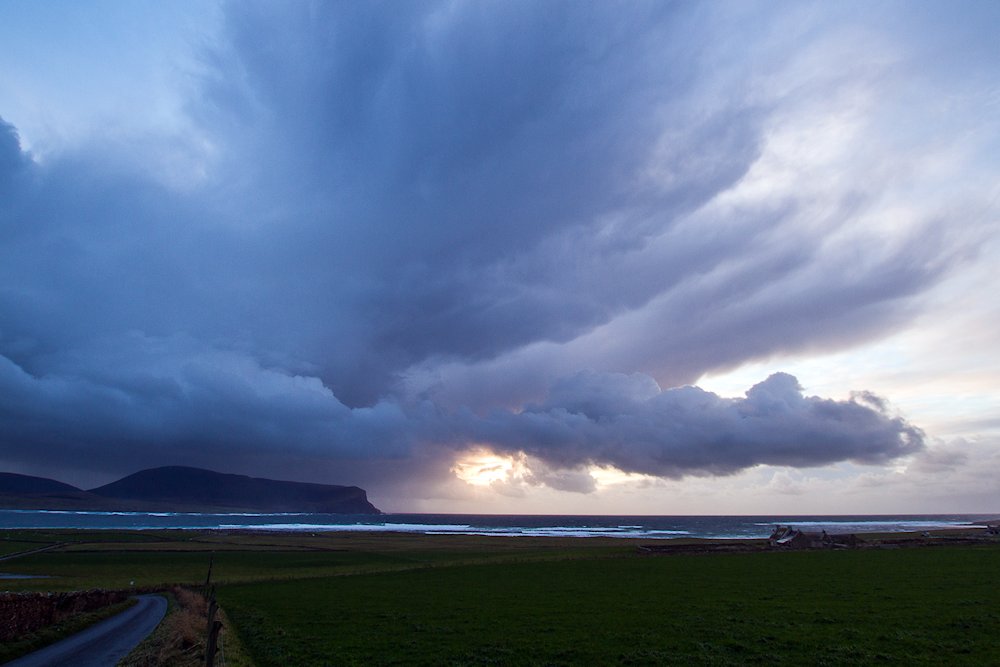 オークニー諸島のホイ島。夏、雲はめまぐるしく変化するが、風はさほど強くなかった。冬は台風なみの風が吹き荒れる。
