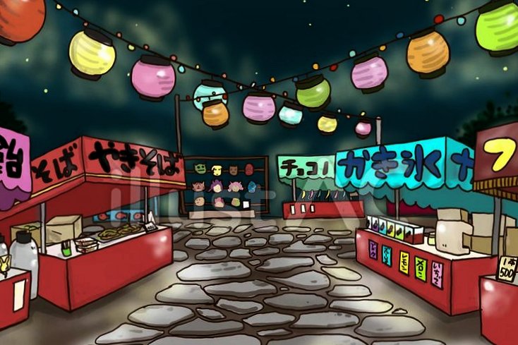 テキ屋は一般的な小売業者ではなく、縁日になると神社仏閣に姿をあらわす。昼間に境内で夜店の準備をして夕方になると営業を始める。金魚すくい、綿菓子、りんご飴、たこ焼き、輪投げ、プラスチックの面、けずり飴、ベビーカステラ、冷やしあめなど多種多様な露店が境内にならぶ。